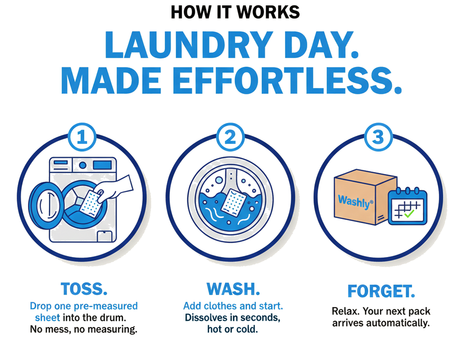 It means one box of Washly® contains 30 sheets, enough cleaning power for 60 standard laundry cycles. Thanks to the pre-perforated sheets, you can get more washes if you frequently run smaller loads.